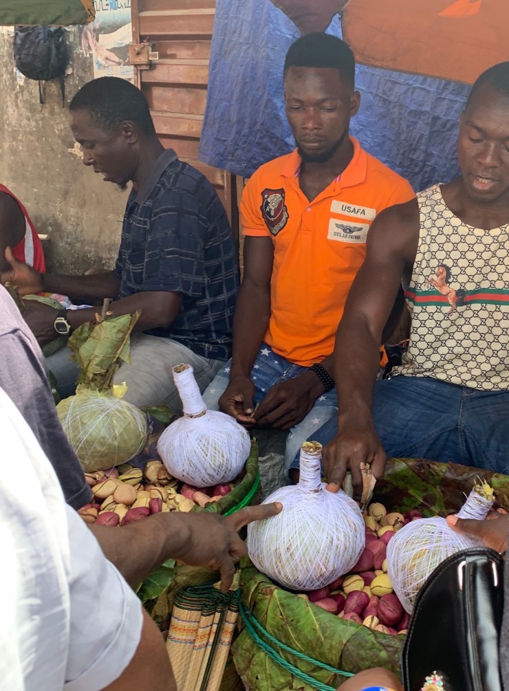 My kola nut bundles were smaller and wrapped in less thread. The pink and white are the sweet and bitter kola. They are both pretty bitter and contain caffeine.