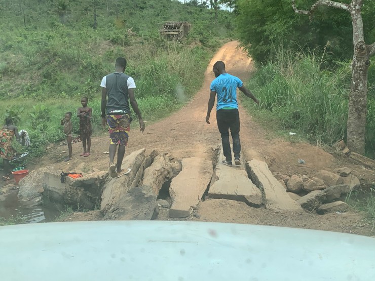 To reach Lake Sonfon and Bumbuna Falls, we drove for hours over very rough roads with homemade bridges past many villages. Here the guides check out a bridge before we attempt it in the car.