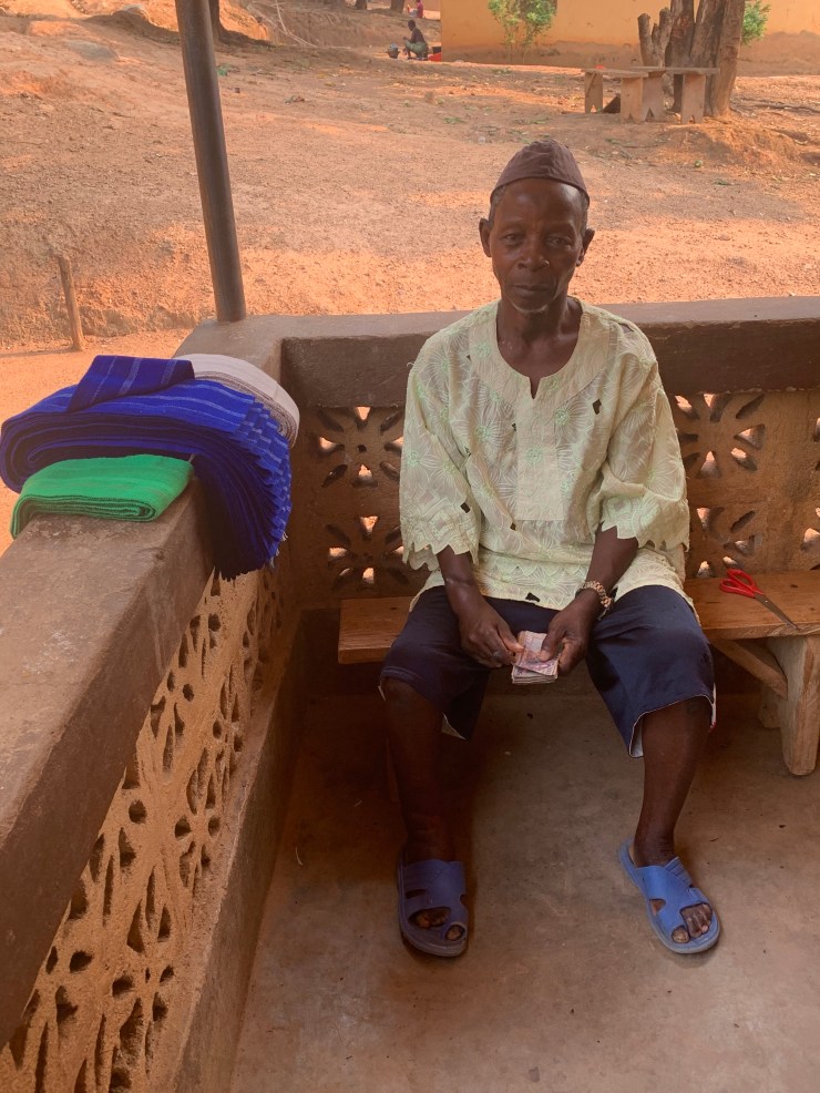 The second weaver was hacked with a panga (machete) and has permanent damage to his right arm and right foot. He is unable to move the fingers on his right hand despite multiple operations. His cloth is laying on the wall next to him. He’s holding money because I just bought some of his cloth. He looks sad because he is. He says it is hard to not be able to take care of his family.