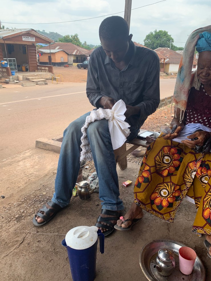 While in the north, I had a chance to visit some local craftspeople and see them working. In Kabala, I visited a housing area established for wounded survivors of the civil war. I two weavers of country cloth. The first, a woman, lost her whole village. She survived by crawling under dead bodies as everyone was shot. She was shot through the chest but survived and somehow crawled and walked until she could get help.
