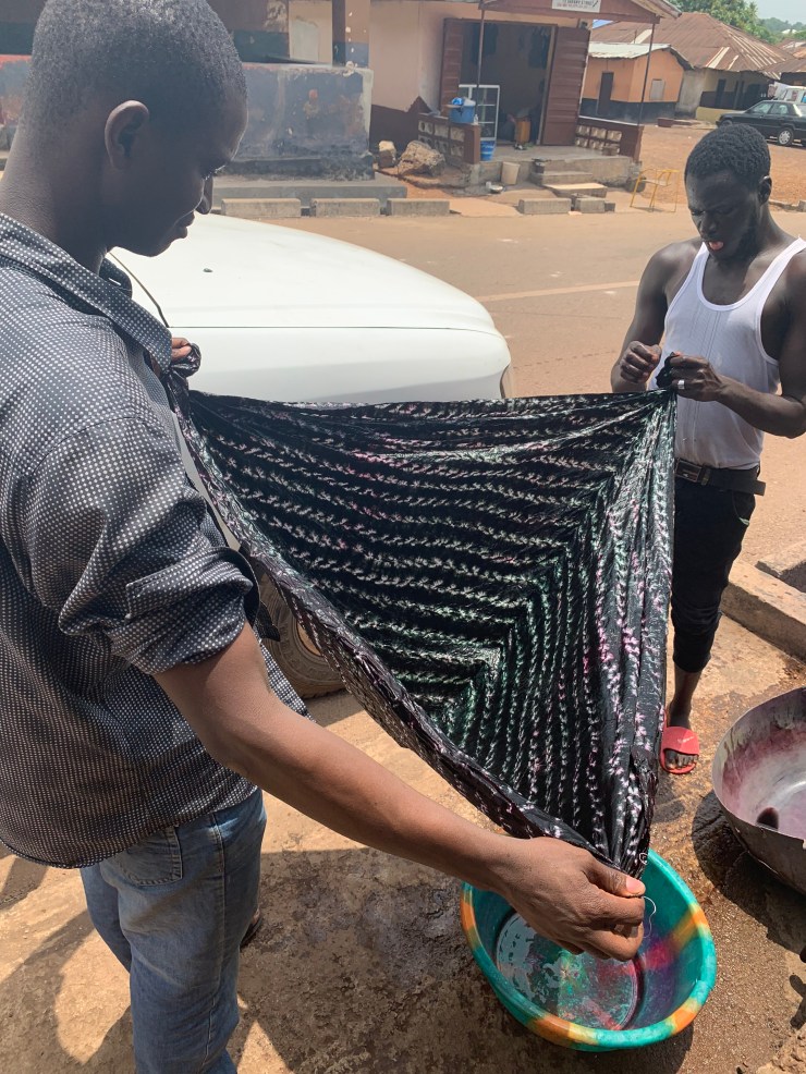 Makeni is known for gara cloth which is tie-dyed. Most of the people that make gara cloth are Mandingo. The traditional dye used is made from kola nuts but most people use commercial dyes. First he sewed the cloth together, then dyed it. It smelled awful. When it first came out it was greenish and then turned maroon in the sun.