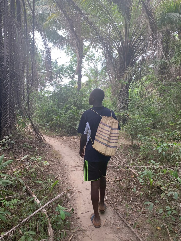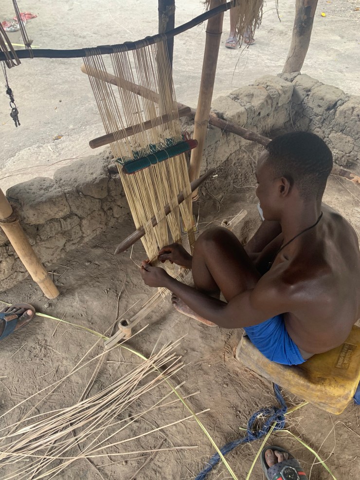In Rogbonko, they specialize in basket weaving. They use part of the palm frond. It is woven on looms like cloth and made into bags. There is another style of basket making for bowls and round containers that be used to store or to attach a strap and carry like a purse.