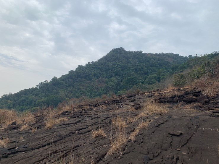 We took a short break in an open area. Above the peak is getting closer but there is still almost an hour of uphill climbing. Note the local guide below in flip flops. When it got really steep, he took them off and went barefoot.