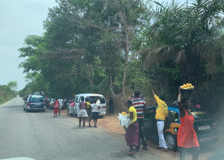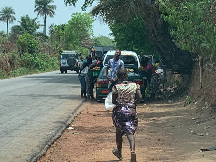 On the way back to Freetown, we shopped for produce – cheaper and fresher than what you can buy in town. When you stop by mango vendors, there is a mad rush to your car. These taxis and buses will go back to Freetown loaded down with mangoes.